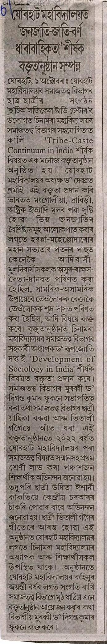 http://jorhatcollegedigitallibrary.in:8080/xmlui/handle/123456789/200| Title: | Lecture Program on TRIBE-CAST CONTINUUM in INDIA organised by Sociological Study Centre in collaboration with Dpt. of Socilogy, Cinnamara College_0001 |