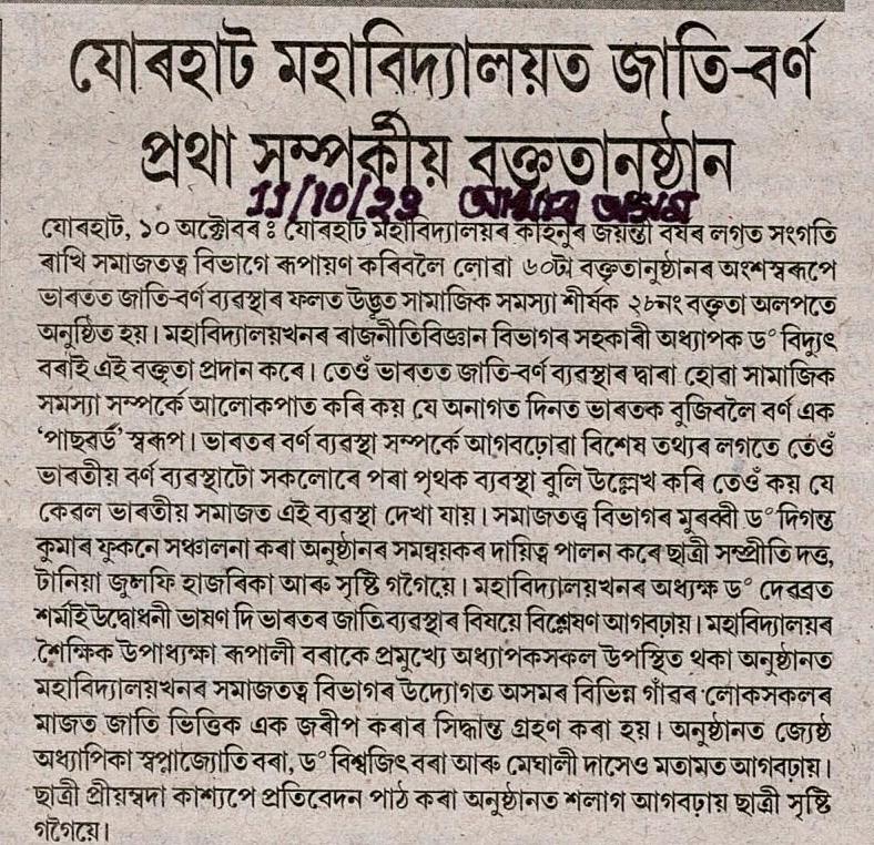 http://jorhatcollegedigitallibrary.in:8080/xmlui/handle/123456789/218| Title: | Lecture Programe on caste system in India |
