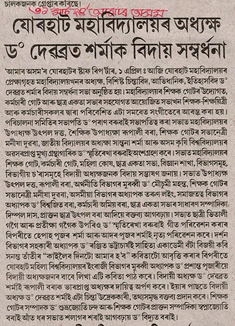 http://jorhatcollegedigitallibrary.in:8080/xmlui/handle/123456789/221| Title: | FAREWELL MEETING OF FORMER PRINCIPAL, Dr. DEVABRATA SHARMA |